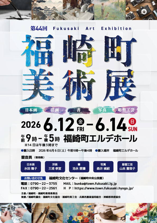 福崎町美術展は、今年で第44回目を迎えます。公募要項により実施しますので、ふるってご出品ください。