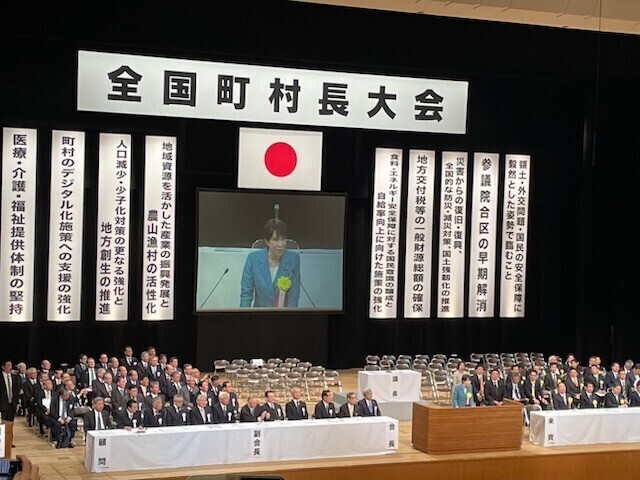 先日、東京NHKホールで開催された全国町村長大会に出席しました。全国の町村長が一堂に会し、地方が抱える課題を共有して国への要望を取りまとめました。大会では、防災・減災対策、国土強靭化の強化や地方創生のさらなる前進など、35項目の重要施策について国に要望することを採択しました。