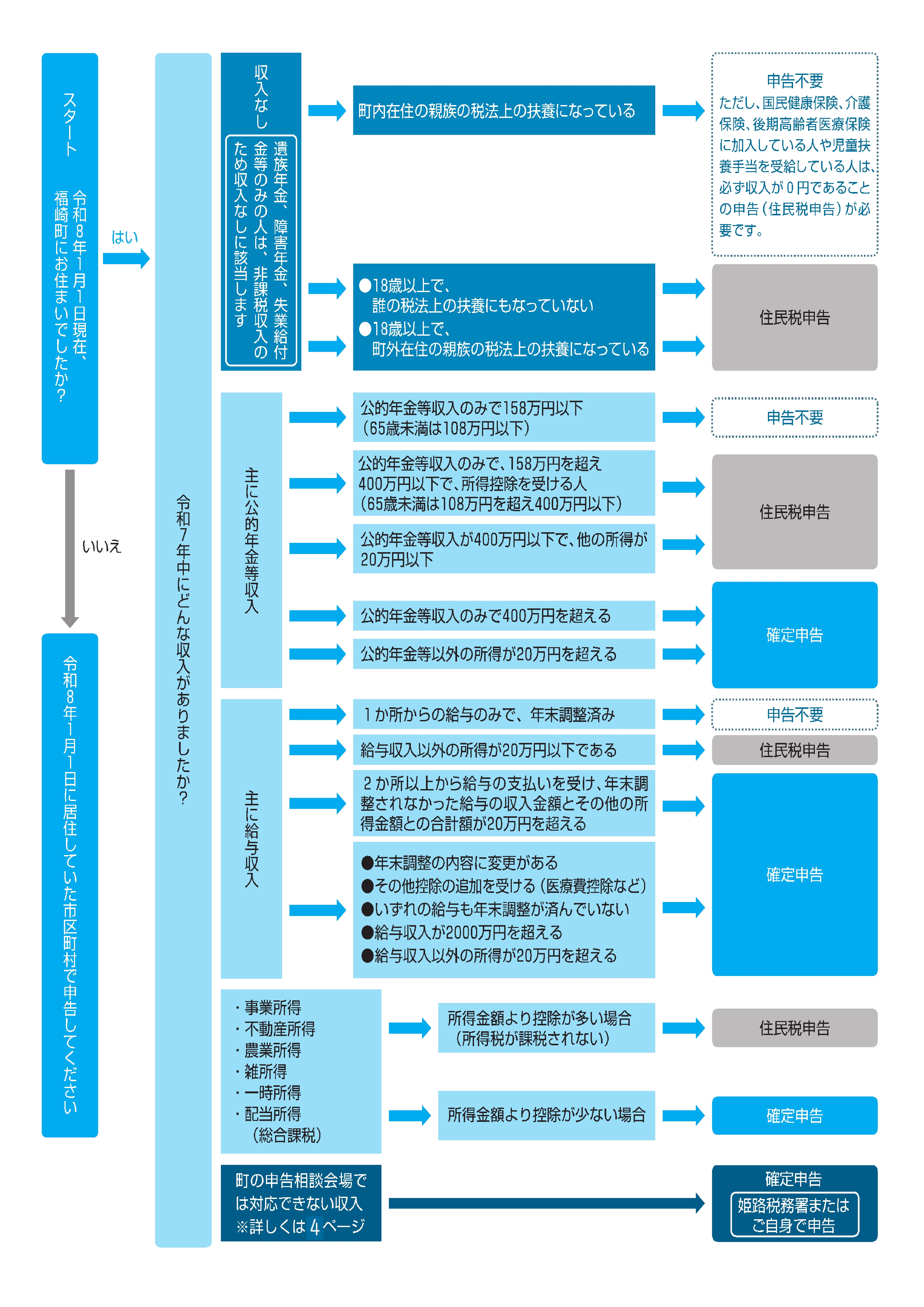 令和8年1月1日現在、福崎町に住民票がある18歳以上の人で、フローチャートに沿って住民税申告が必要となった人は、住民税申告書を福崎町役場税務課までご提出ください。