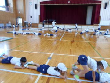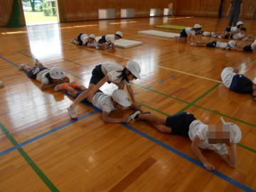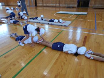 1組と2組の合同体育で、初めてのマット運動をしました。