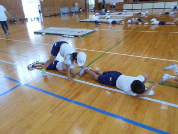 ゆりかごをしたり、マットの準備と片づけを学んだりしました。友だちの上をクマ歩きで通りました。