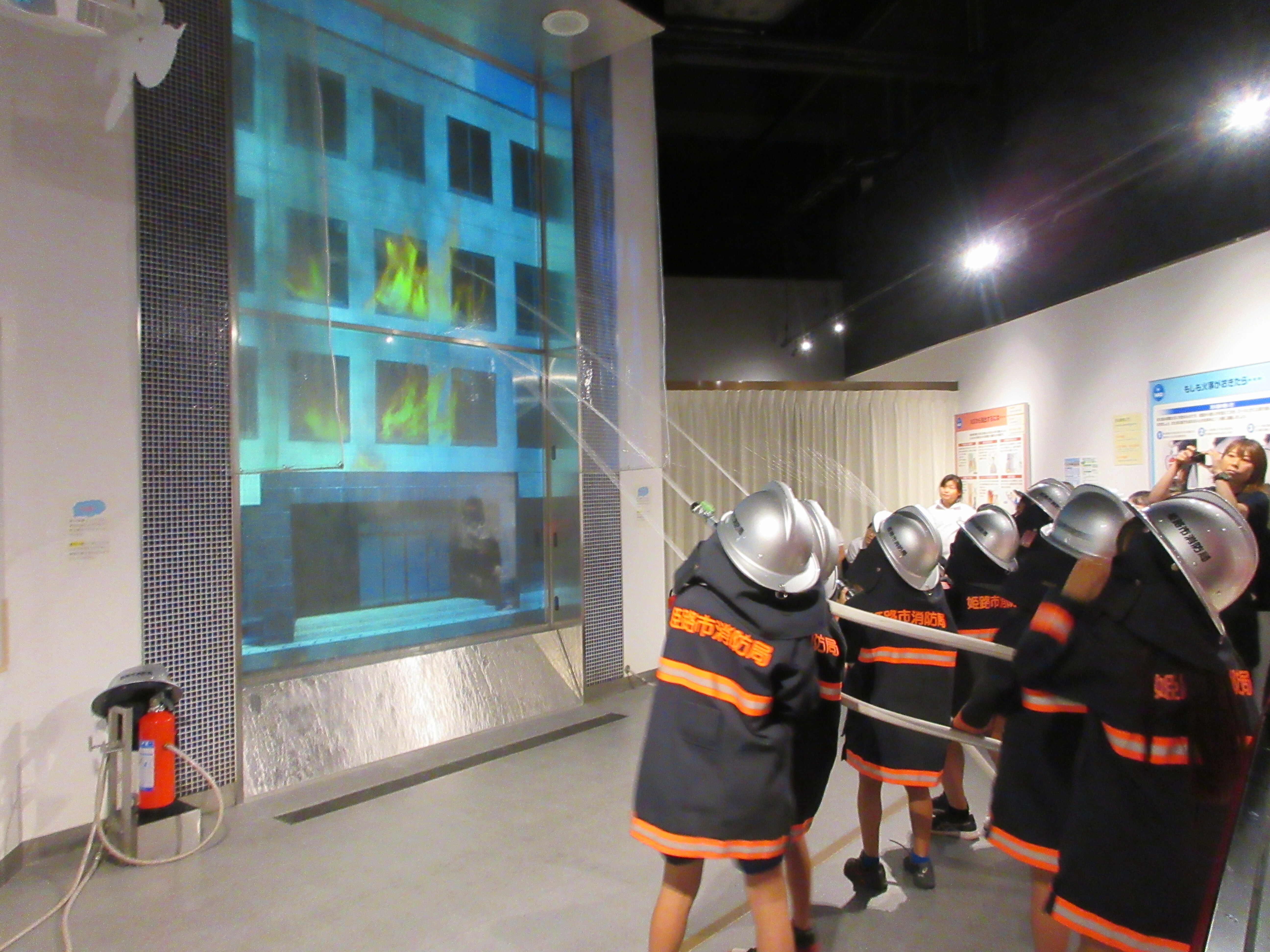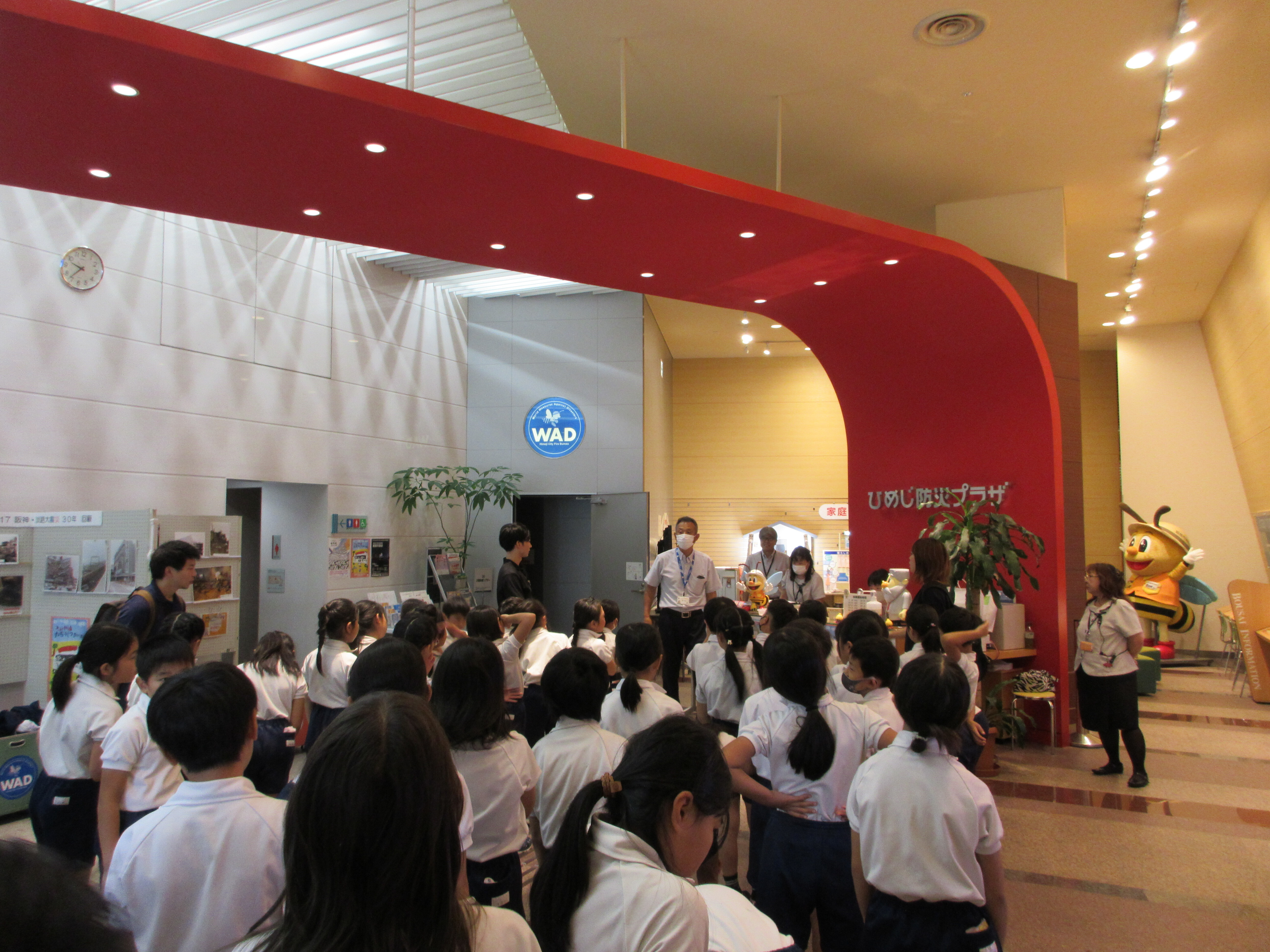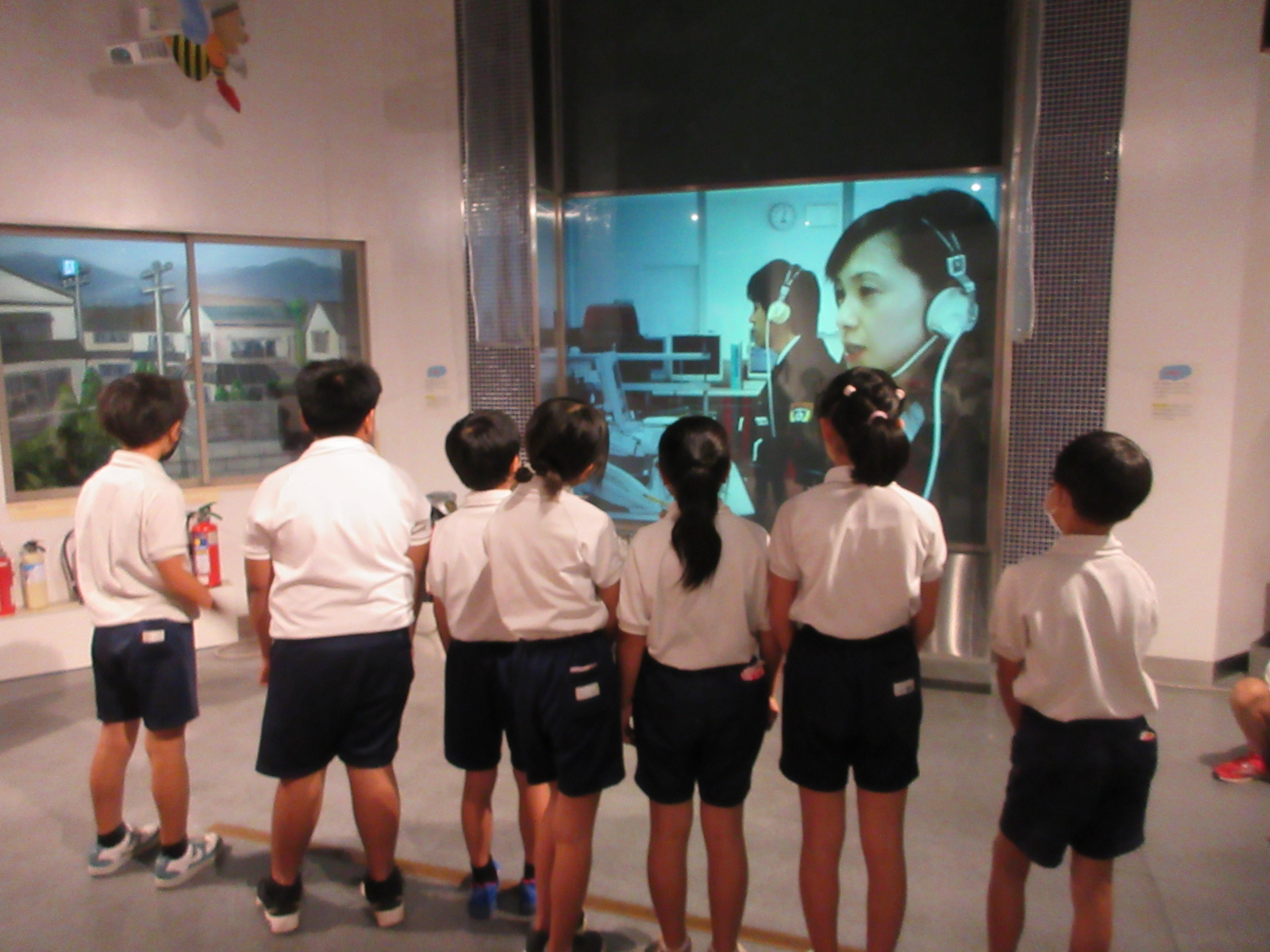 あいにくの雨でしたが、子ども達はマナー良く電車に乗り、頑張って歩いて防災プラザまで向かいました。現地では、水難レスキュー車や救助のための道具や服を見せていただきました。放水体験では、防火服とヘルメットを身につけ、実際に放水を行いました。災害のおそろしさを学び、防災への意欲を高めることができ、今後に活かしたいという思いが子ども達の中に広がったように感じます。