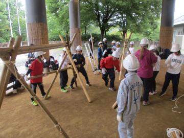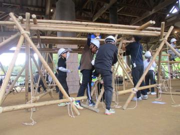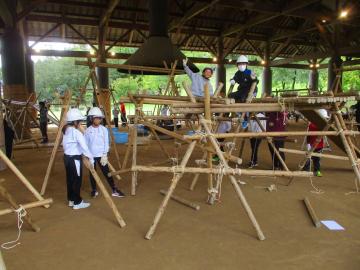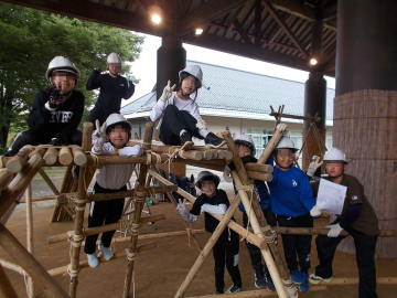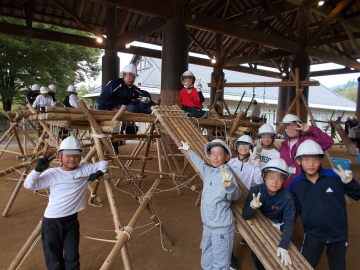 みんなで協力して丸太を組み上げます