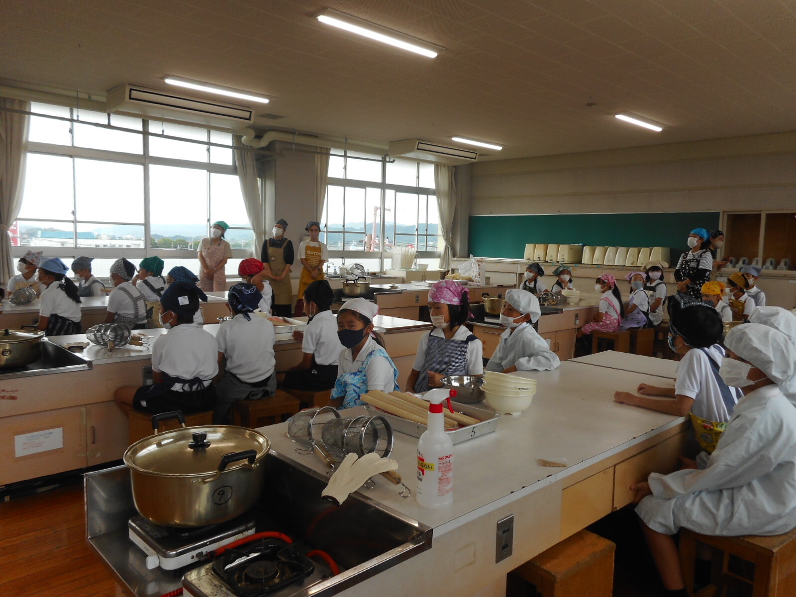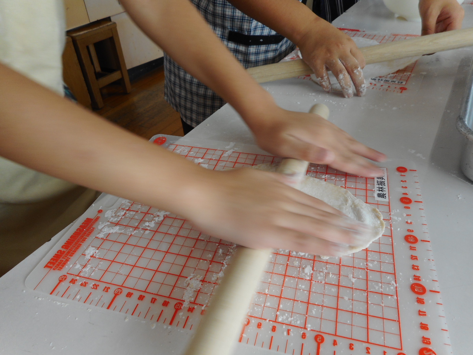 そして、9月24日には、役場の農林振興課の方に来ていただき、もちむぎ麵打ち体験をしました。もちむぎの粉を水を混ぜて手でこねて麺を作っていきました。自分たちで手作りした面は格別だったようです。