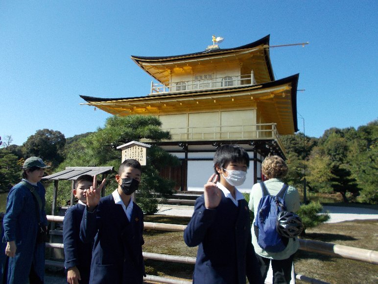 《金閣》銀閣の渋さとは対照的に、2億円以上の金箔を貼った金閣のまばゆさがたまりません。「きっれい!」という声があちらこちらから聞こえてきました。想像以上の輝きに圧倒され、目がおなか一杯になったようです。