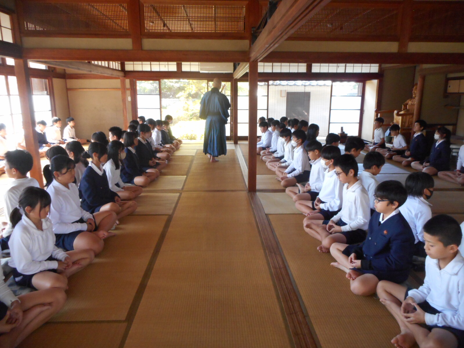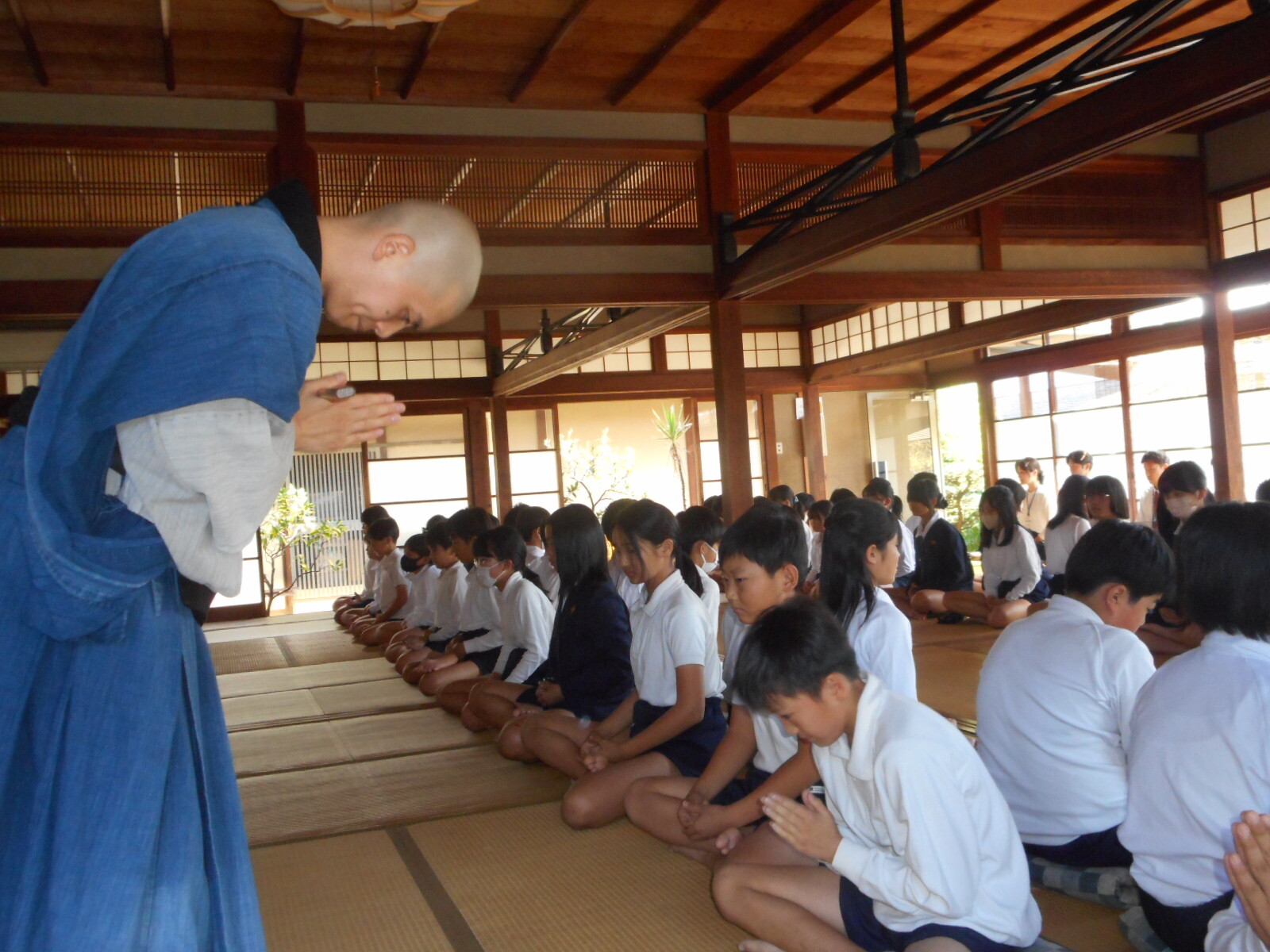 《大仙院(座禅体験・法話)》足や手の組み方、呼吸の仕方などを教えていただいた後、修行僧の方と同じ25分間の座禅の体験しました。申し出た人は、警策で肩を叩いてもらい、心を落ち着かせて、自分の心と向き合いました。
