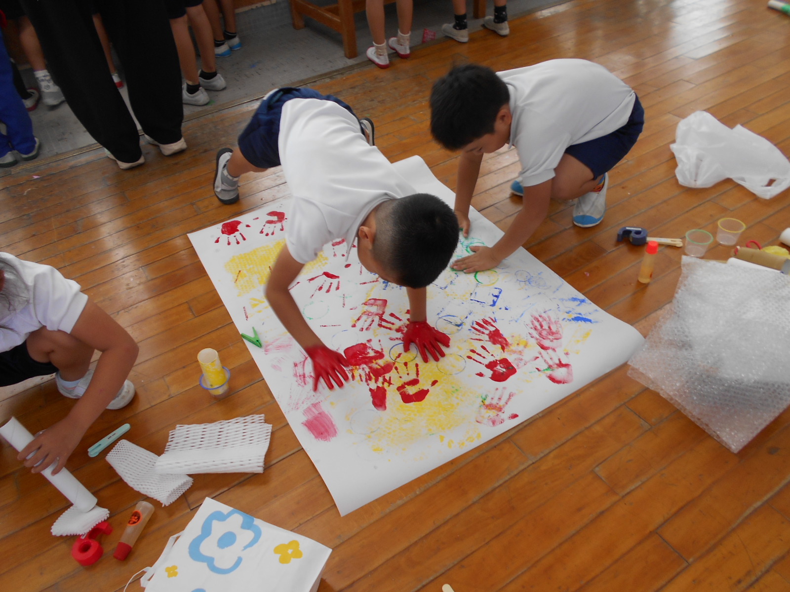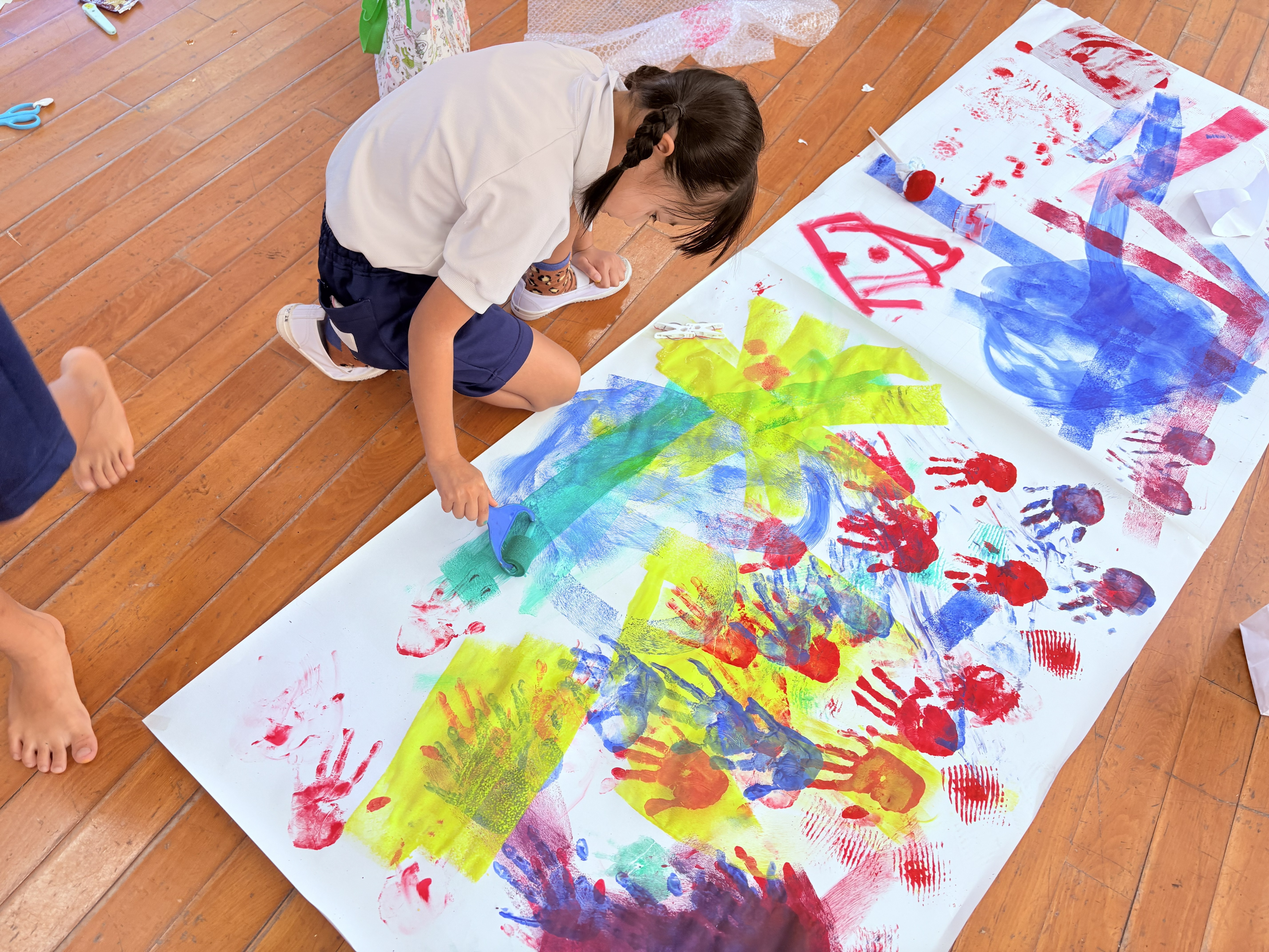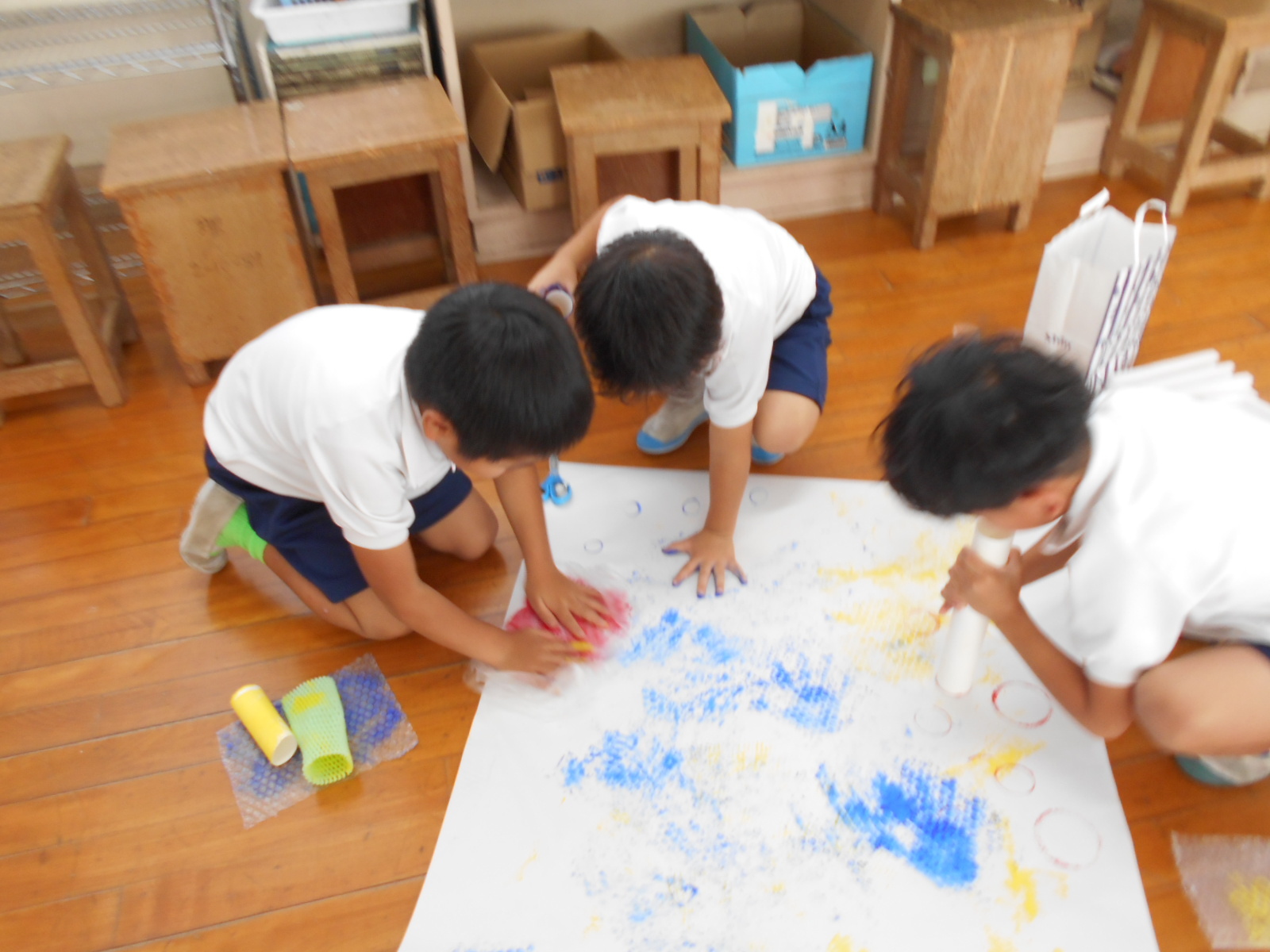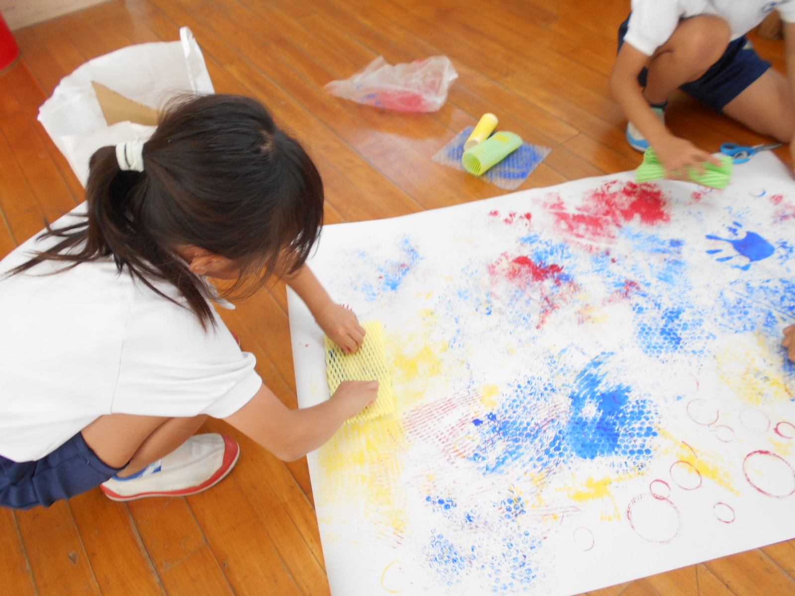 手や足などに絵の具をつけて、模造紙に形を写しました。他にも、梱包材をぺったんしたり、トイレットペーパーの芯をコロコロしたりして、感触やできた模様を楽しみました。