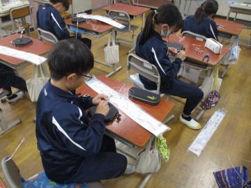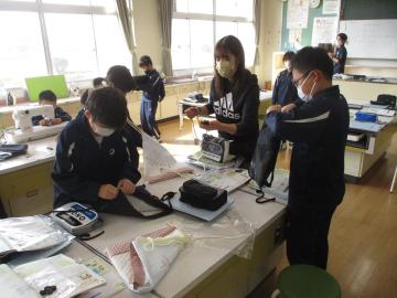 5年生が家庭科の時間に作成してきたナップサックが縫い終わりました。