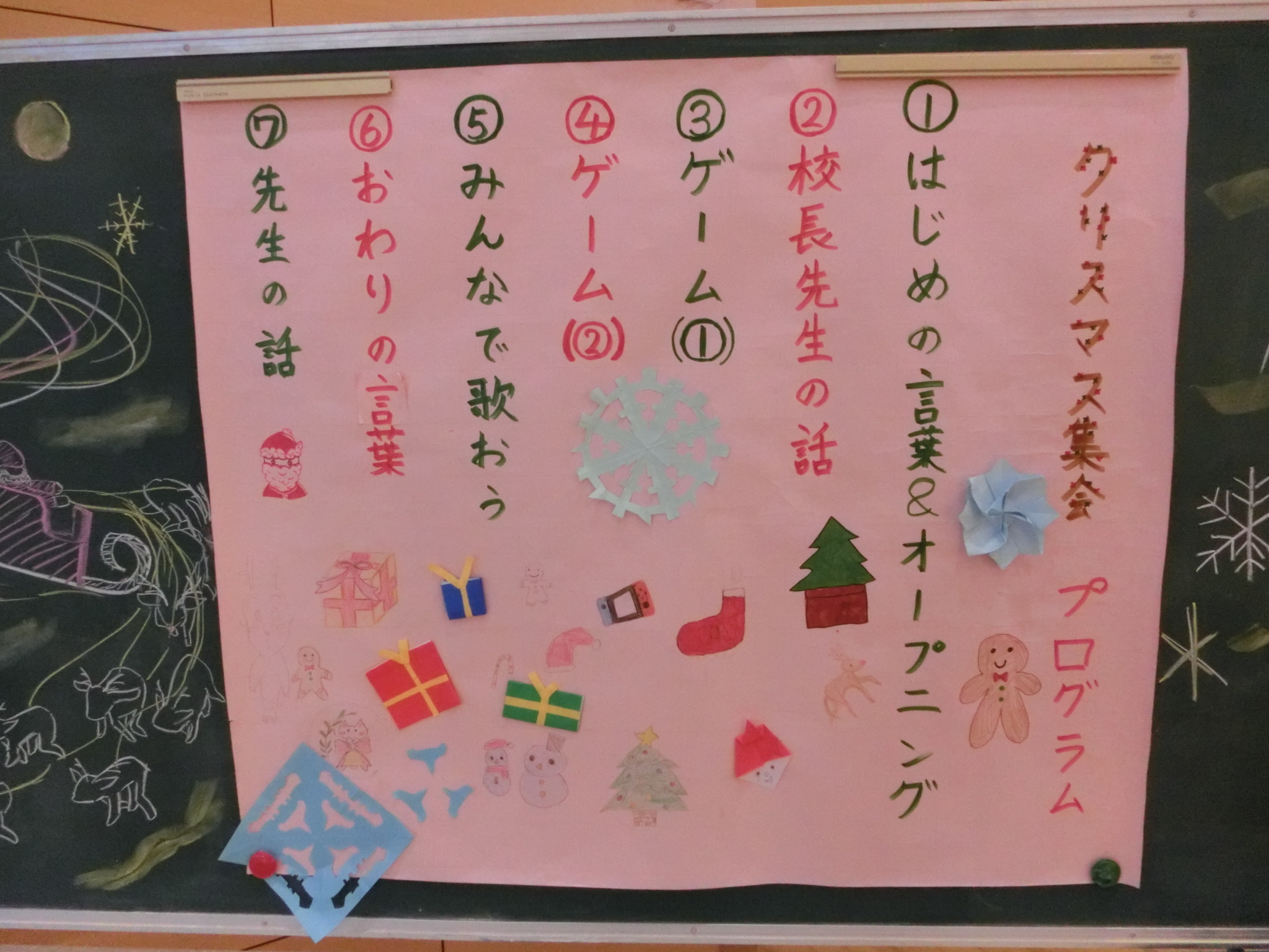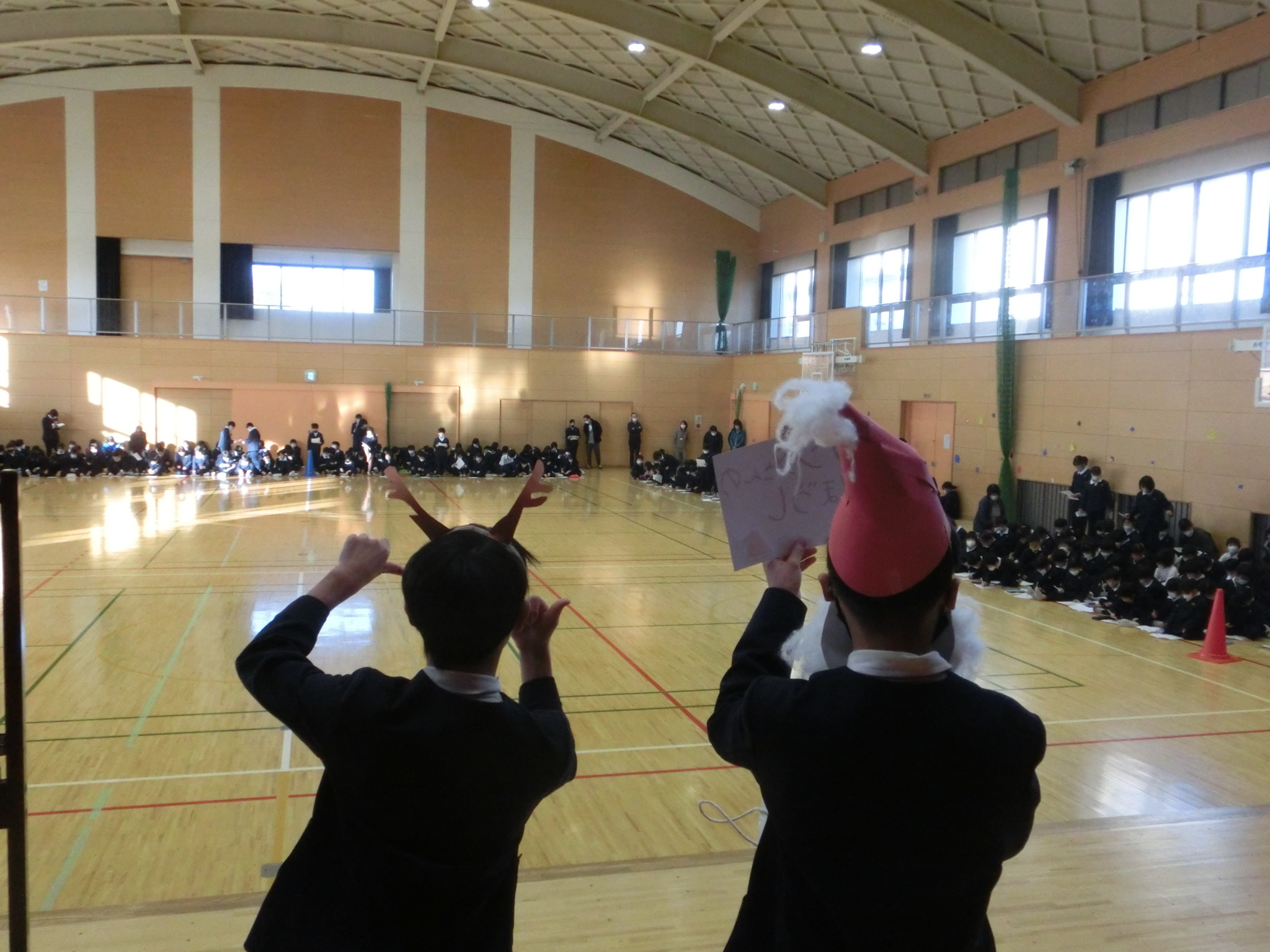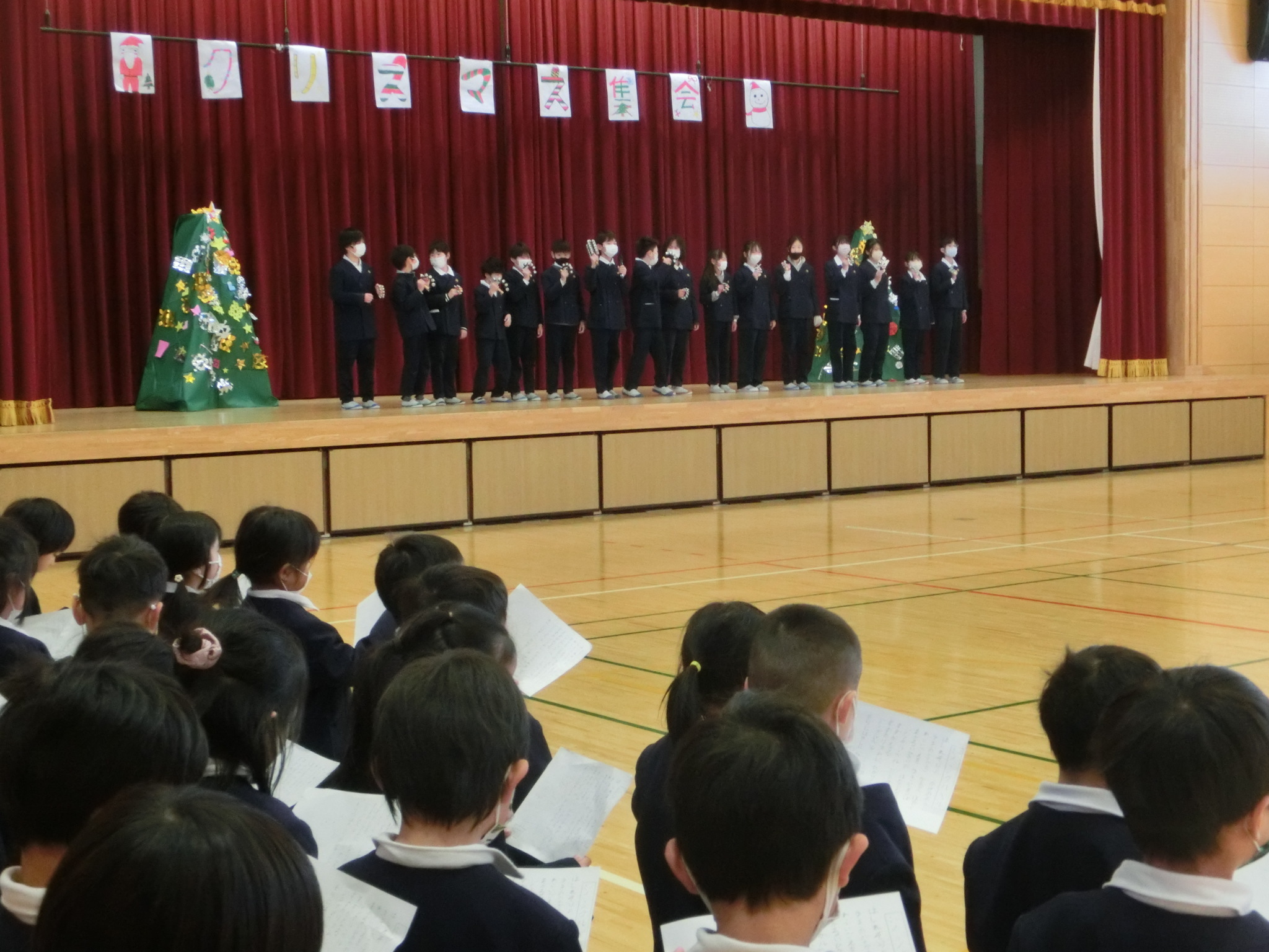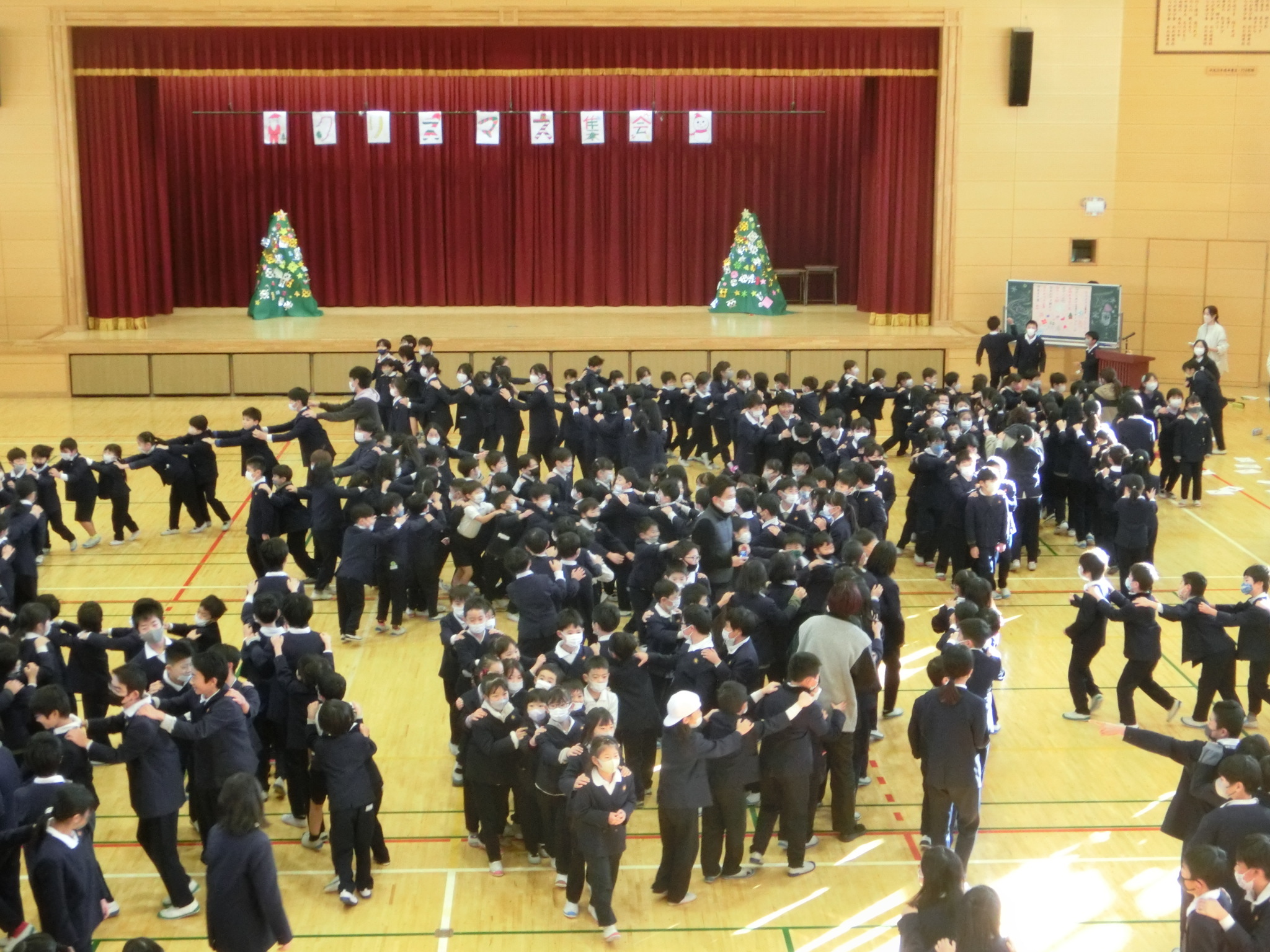 児童会主催のクリスマス集会が体育館で行われました。代表委員会で、BGM<放送委員会>、はじめの言葉&オープニング<運営委員会>、ゲーム「クリスマスビンゴ」<環境委員会>、ゲーム「サンタ列車」<集会委員会>、みんなで歌おう<給食委員会>、終わりのことば<運営委員会>、飾り付け<掲示委員会・運動委員会・図書委員会>、看板取り付け<保健委員会>、プログラム準備<栽培委員会>と役割分担を決定し、みんなで力を合わせて集会の成功に向けがんばりました。気温は2℃でしたが、ほっこりとした気分になれました。