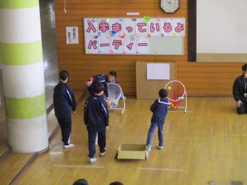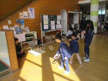 多目的ホールにもどってからは、玉入れ、輪投げ・空き缶積み…などのゲームを楽しんだり、ランドセル背負い体験をしたりしました。